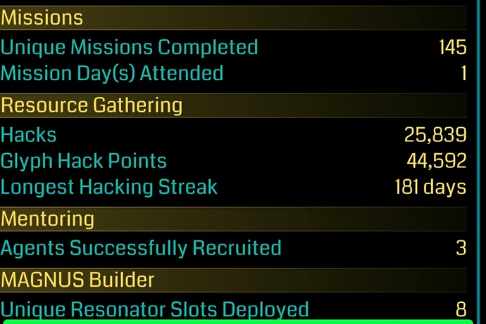 Buat mempermudah kamu keep track berapa poin yang sudah kamu dapat, ada penambahan statistik baru di tab Agent kamu selama campaign ini berlangsung. Kalau sampai sekarang belum muncul, SETELAH DEPLOY coba deh restart hp kamu, kalau perlu sampai beberapa kali. Hasilnya di tab AGENT All Time kamu.. kayak gini: